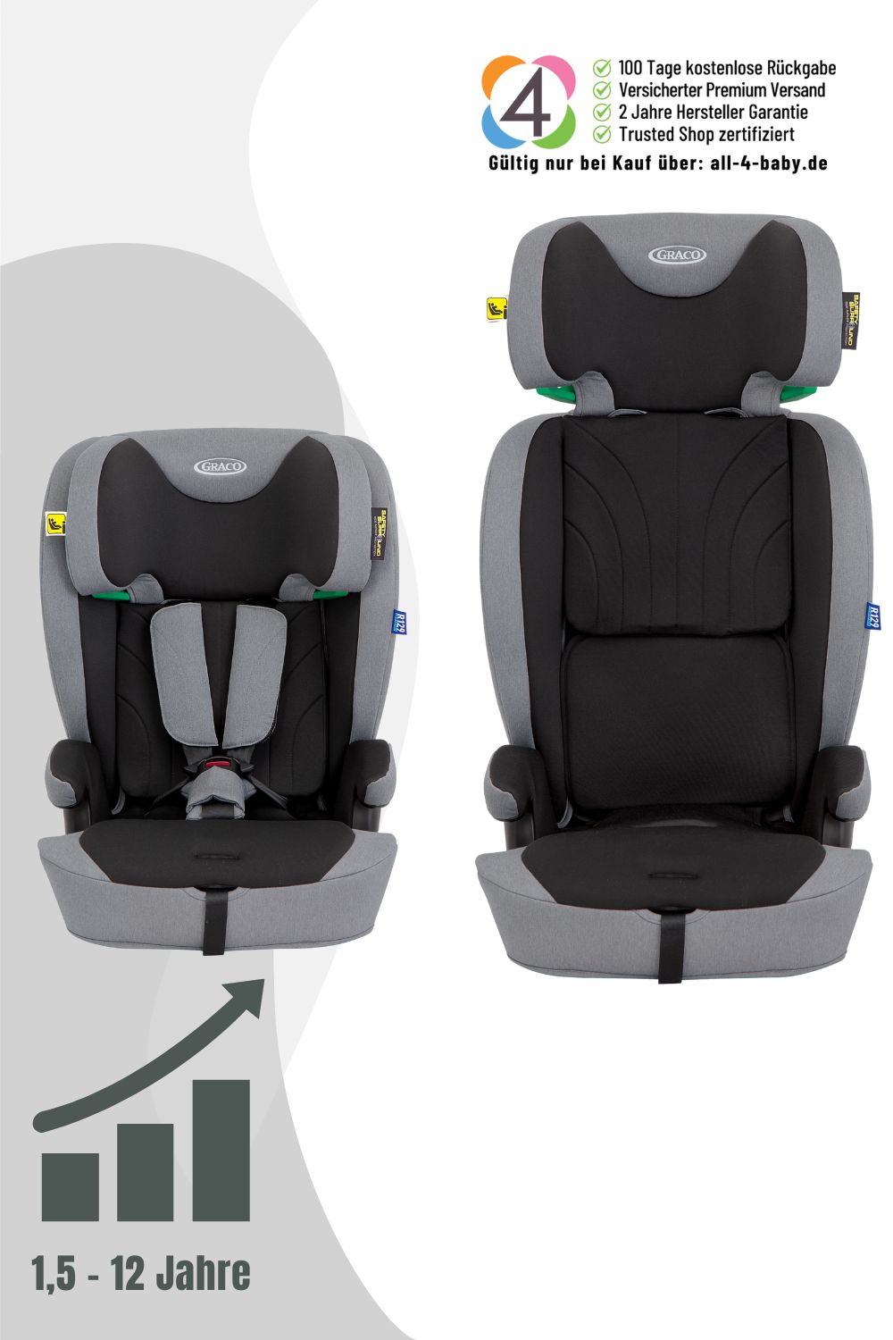 Dieser innovative Kindersitz ist nach der neuesten R129-Norm zugelassen und i-Size zertifiziert, was für Euch bedeutet, dass Ihr in jeder Fahrsituation auf höchste Sicherheitsstandards zählen könnt. Mit dem Graco Energi i-Size Kindersitz seid Ihr bestens gerüstet, um Euer Kind auf jeder Fahrt optimal zu schützen.