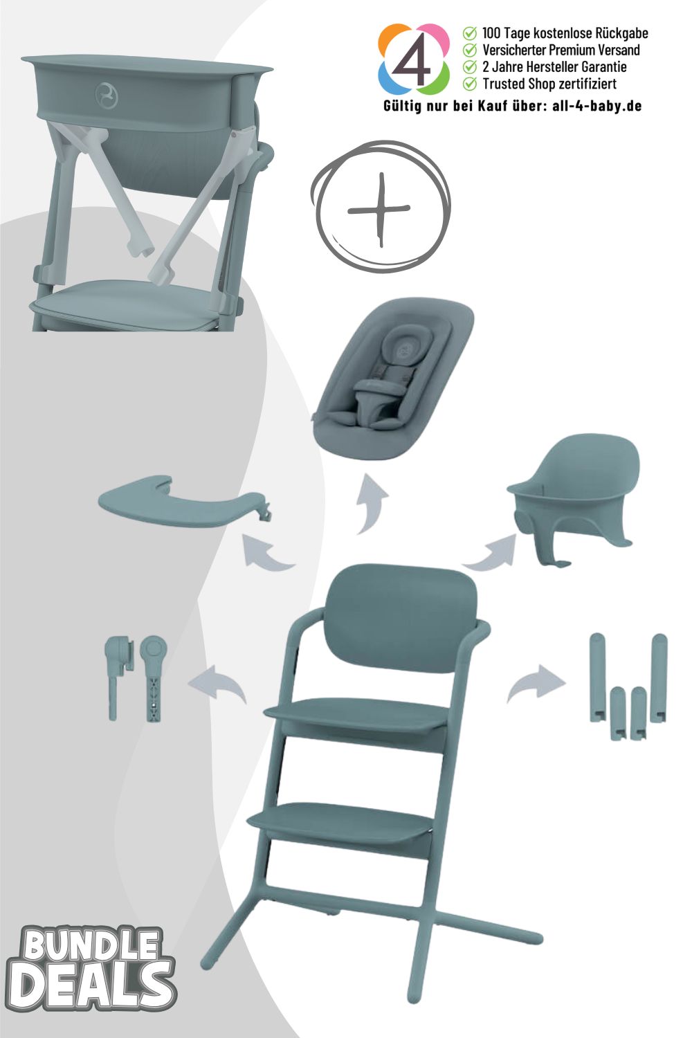 - Mitwachsender 5in1-Hochstuhl von Geburt bis Kleinkindalter, inklusive Newborn-Bouncer, Babyset, Tisch und LemoTower – grows with your child from birth to toddler, including bouncer, baby set, tray and tower