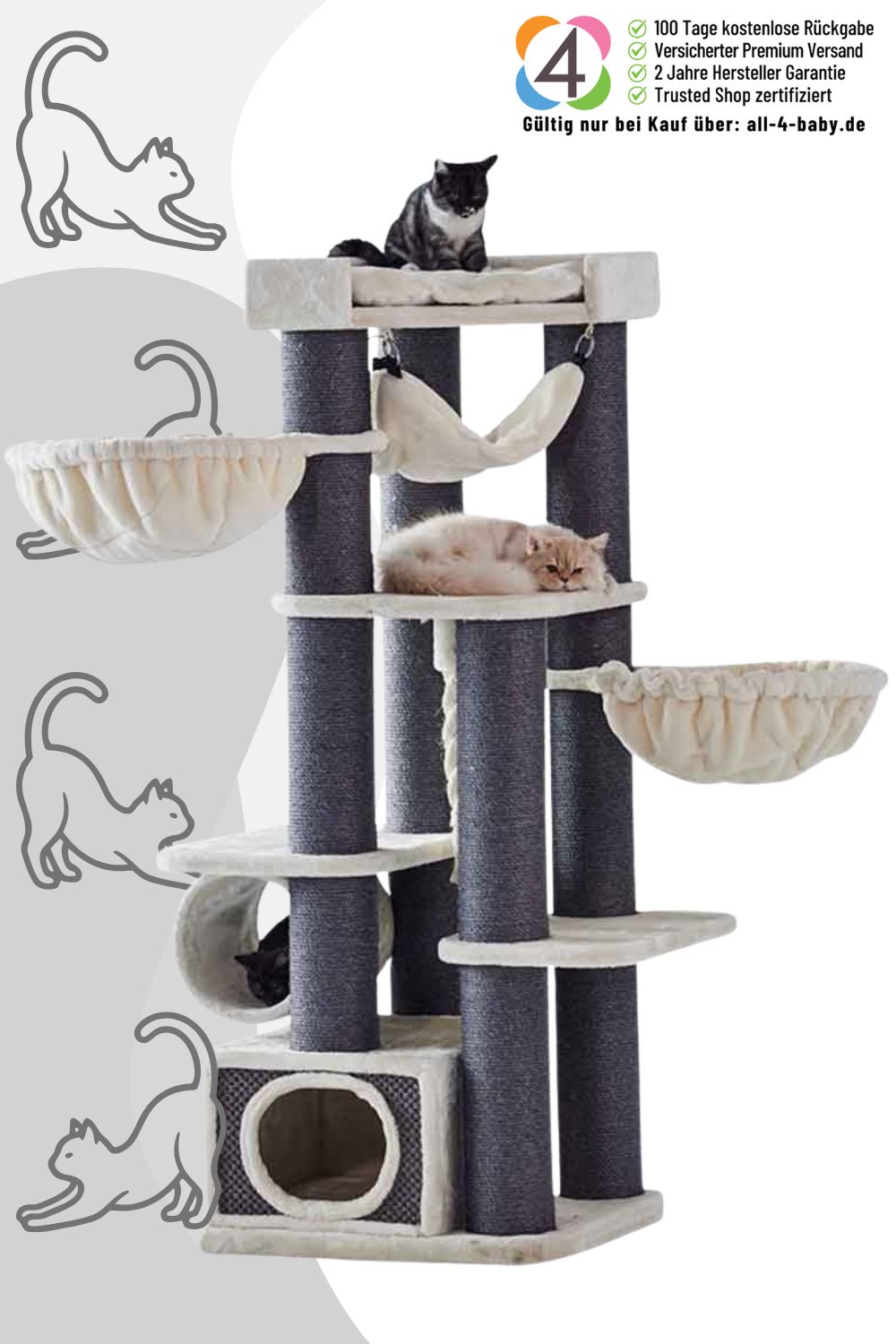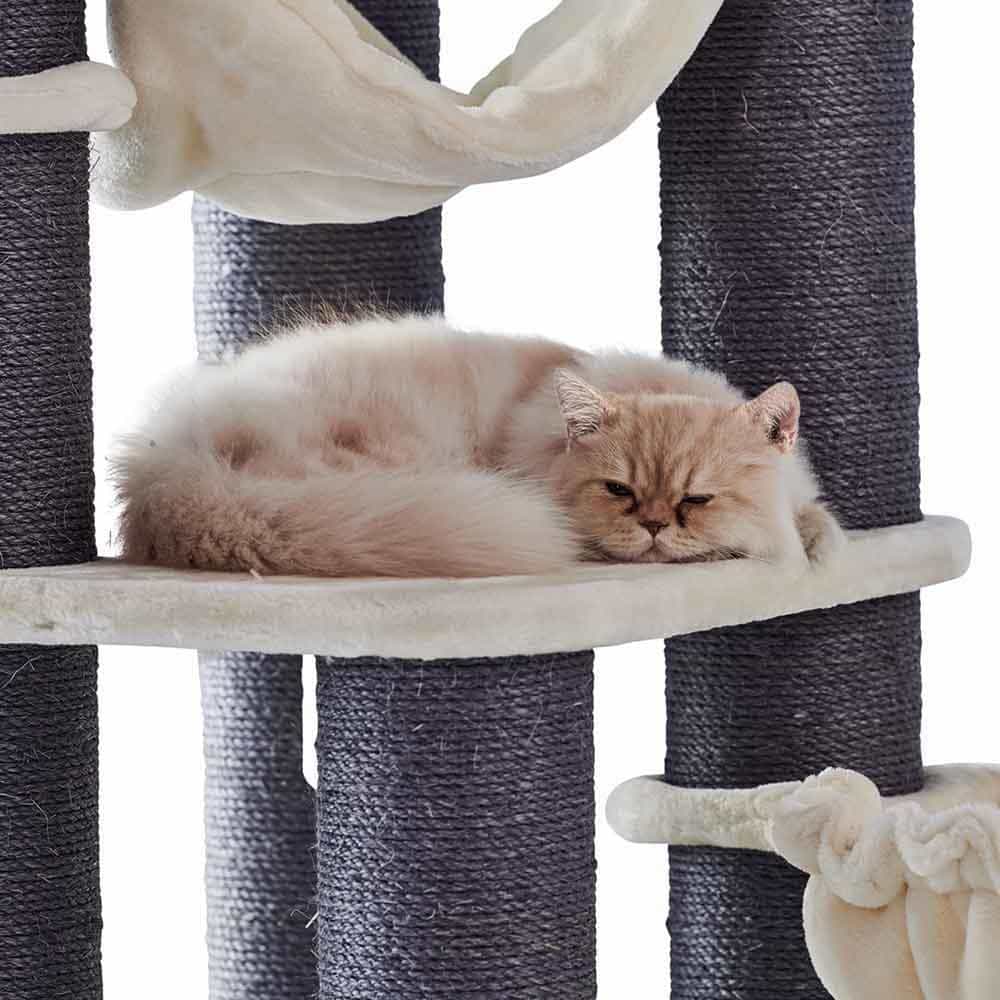 Entspannt eure Katzen in kuscheligen Liegemulden oder auf der großen Platte mit weichem Kissen. Eine Höhle mit Sisalflächen und eine Hängematte bieten gemütliche Rückzugsmöglichkeiten. Das Spielseil sorgt mit 60 cm Länge für wilden Spaß und perfekte Krallenpflege.
