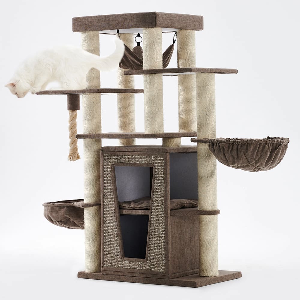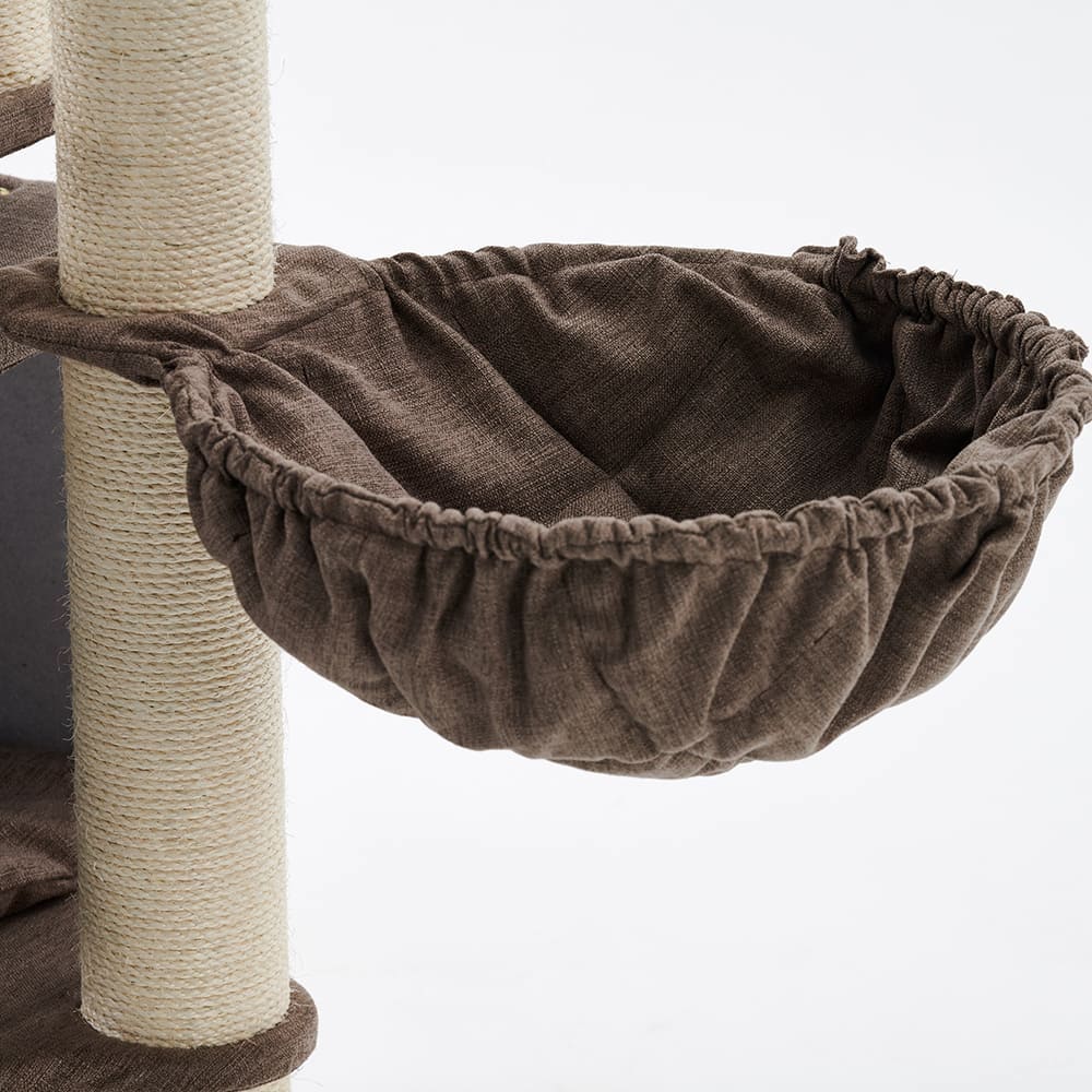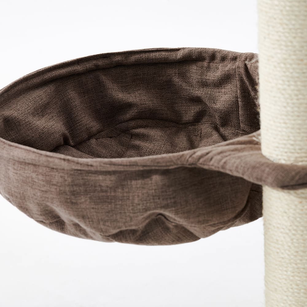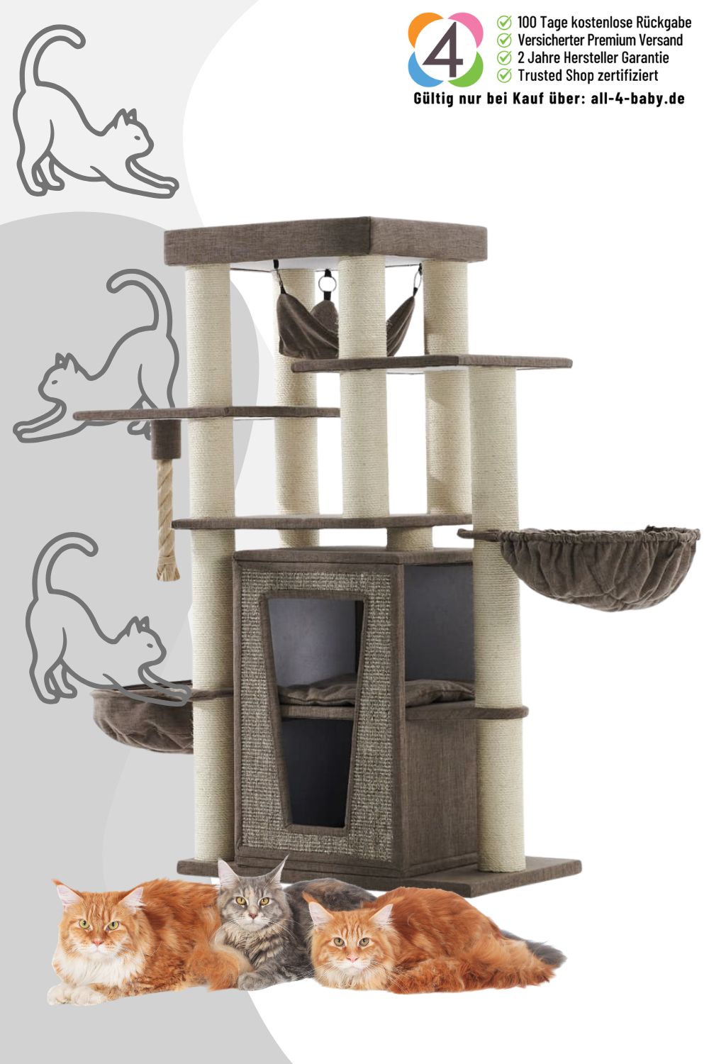 Stellt euch vor: Meine große Höhle mit zwei Ebenen ist der ultimative Rückzugsort, wo eure Katzen sich sicher und geborgen fühlen. Zwei kuschelige Liegemulden und eine entspannende Hängematte laden zum Dösen ein, ergänzt durch viele extra Liegeflächen für pure Erholung.