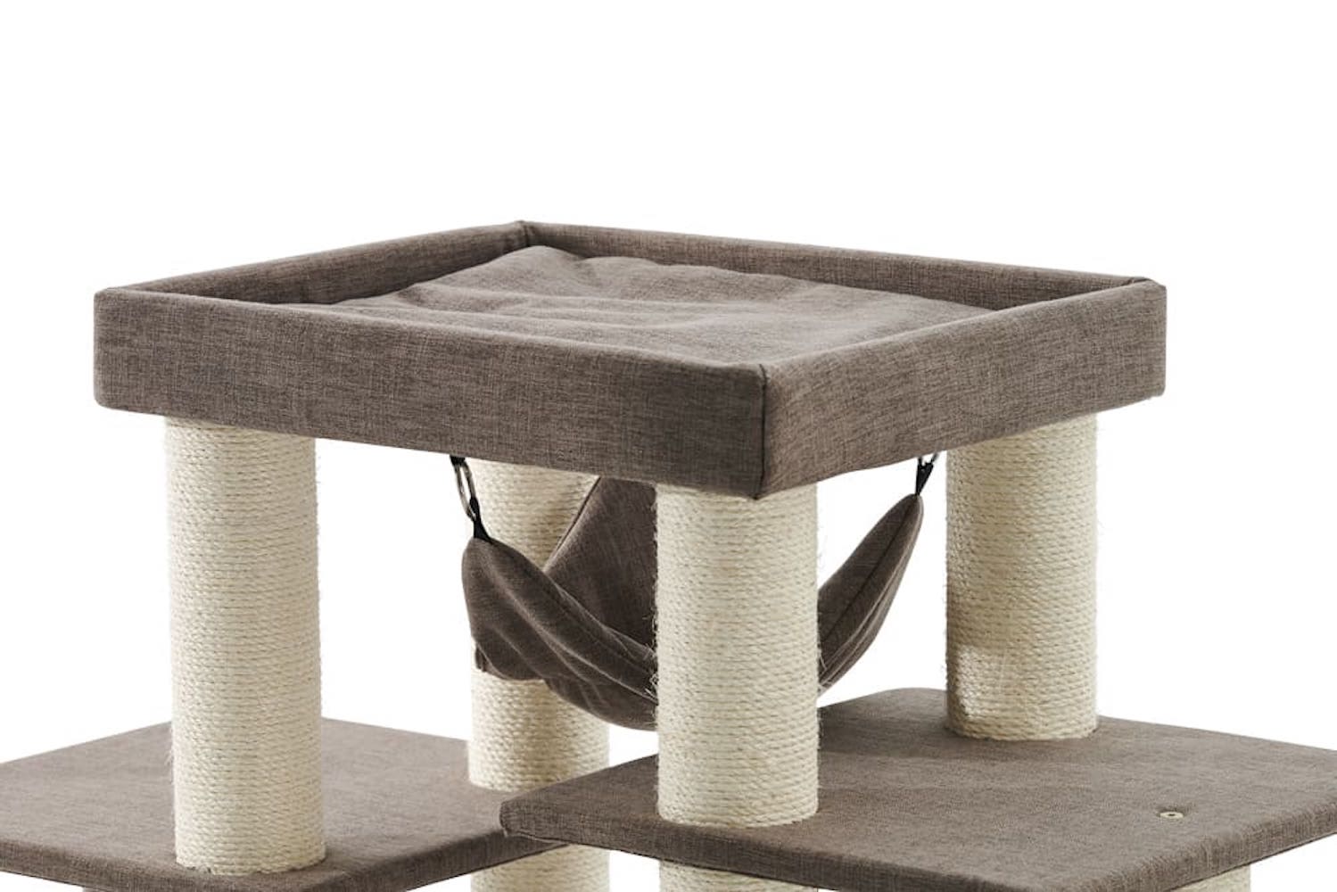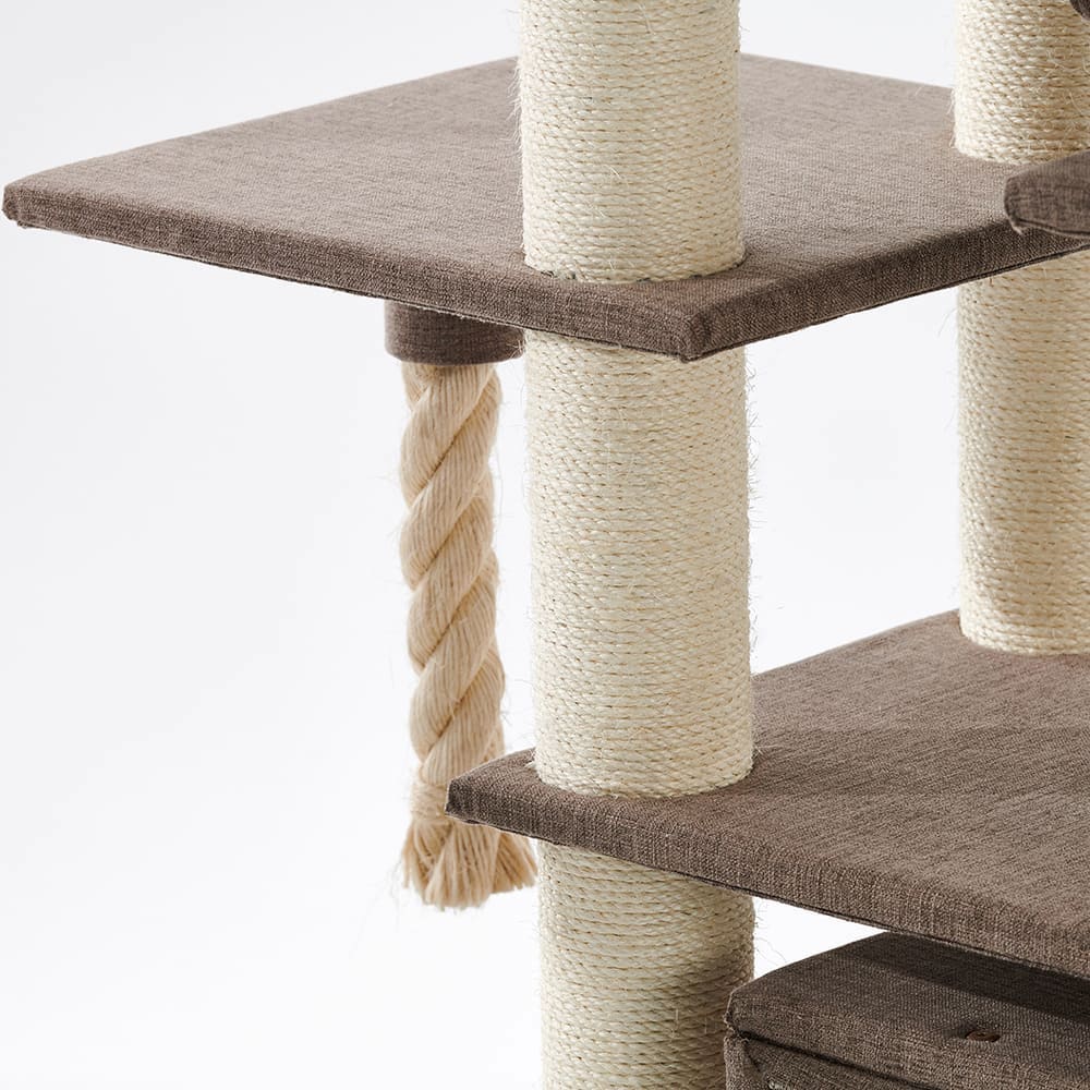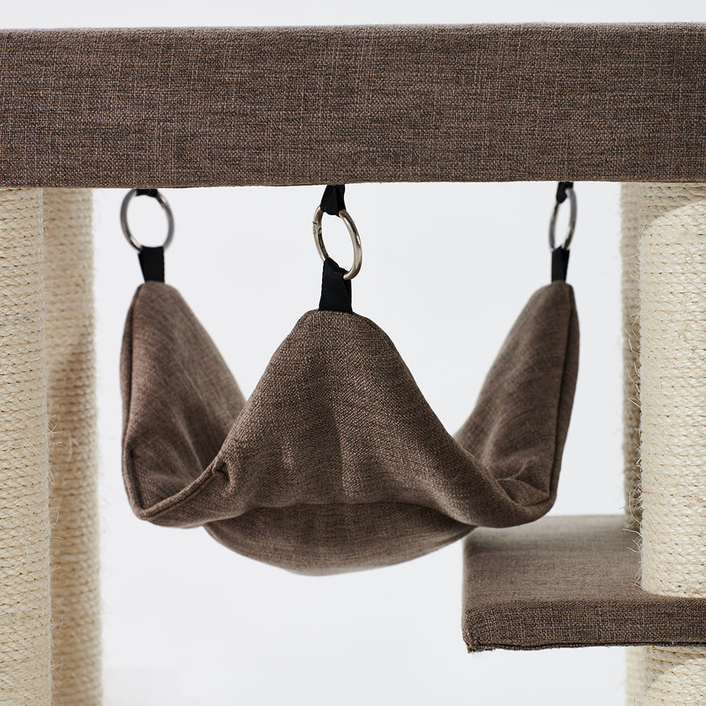 Eine große Höhle mit zwei Ebenen dient als sicherer Rückzugsort. Zwei Liegemulden und eine Hängematte sorgen für gemütliches Entspannen, ergänzt durch viele zusätzliche Liegeflächen. Das 40 cm Spielseil bringt extra Spaß und Bewegung.