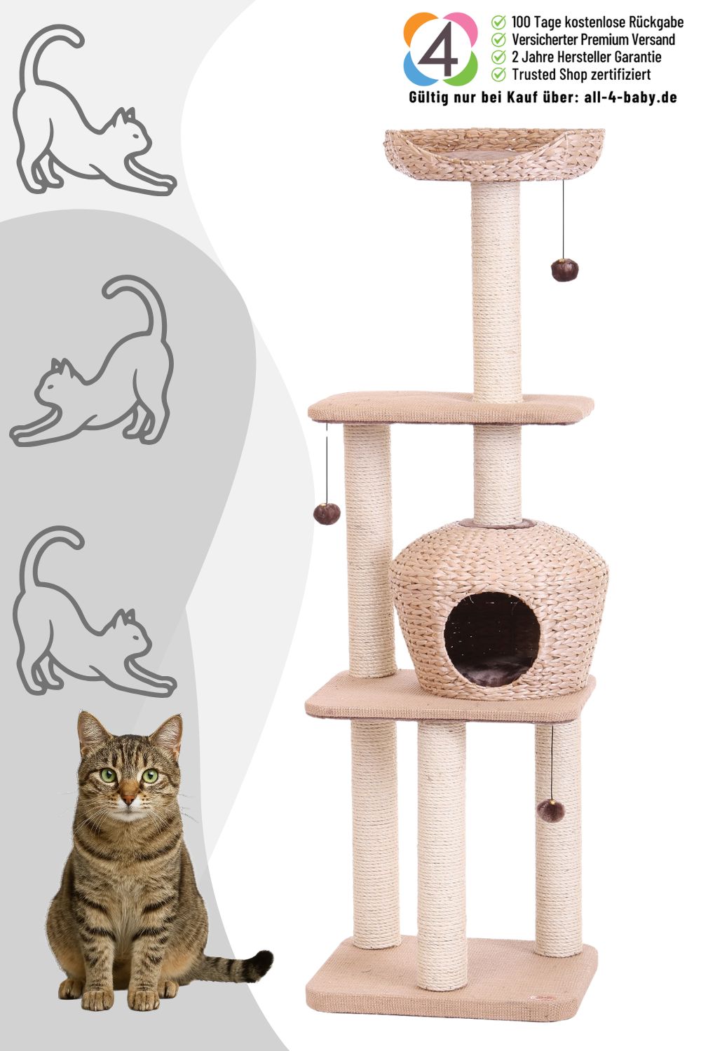 Meine robusten Sisalstämme mit einem Durchmesser von 9 cm sind ideal als Kratzflächen für die tägliche Krallenpflege. So bekommt eure Katze eine unwiderstehliche Alternative zum Kratzen und eure Möbel sowie Teppiche bleiben sicher geschont. Die gemütliche Höhle aus geflochtener Wasserhyazinthe wird schnell zum geschützten Rückzugsort, in dem sie sich entspannen und ausruhen kann. Direkt darüber lockt eine bequeme Liegeplatte, ebenfalls aus Wasserhyazinthe, zu entspanntem Dösen in erhöhter, sicherer Position.
