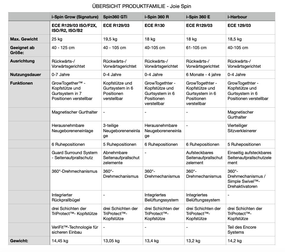 Der i-Spin 360 R ist ein innovativer Joie Spin Kindersitz Reboarder, der die höchsten Sicherheitsstandards erfüllt. Mit der 360-Grad-Drehfunktion ermöglicht der Joie Spin Kindersitz Reboarder ein einfaches Ein- und Aussteigen des Kindes und eine mühelose Anpassung der Fahrtrichtung. So könnt Ihr euren Nachwuchs bequem ein- und ausladen, ohne den Sitz zu bewegen oder umständlich hantieren zu müssen. Zudem spielt Komfort eine entscheidende Rolle, damit sich euer Kind während der Fahrt auch wohlfühlt. Daher verfügt dieser Joie Spin Kindersitz Reboarder über mehrere Sitz- und Ruhepositionen, die an die Bedürfnisse eures Kindes angepasst werden können. Die weich gepolsterte Sitzfläche und die verstellbare Kopfstütze sorgen für Bequemlichkeit auf längeren Reisen.