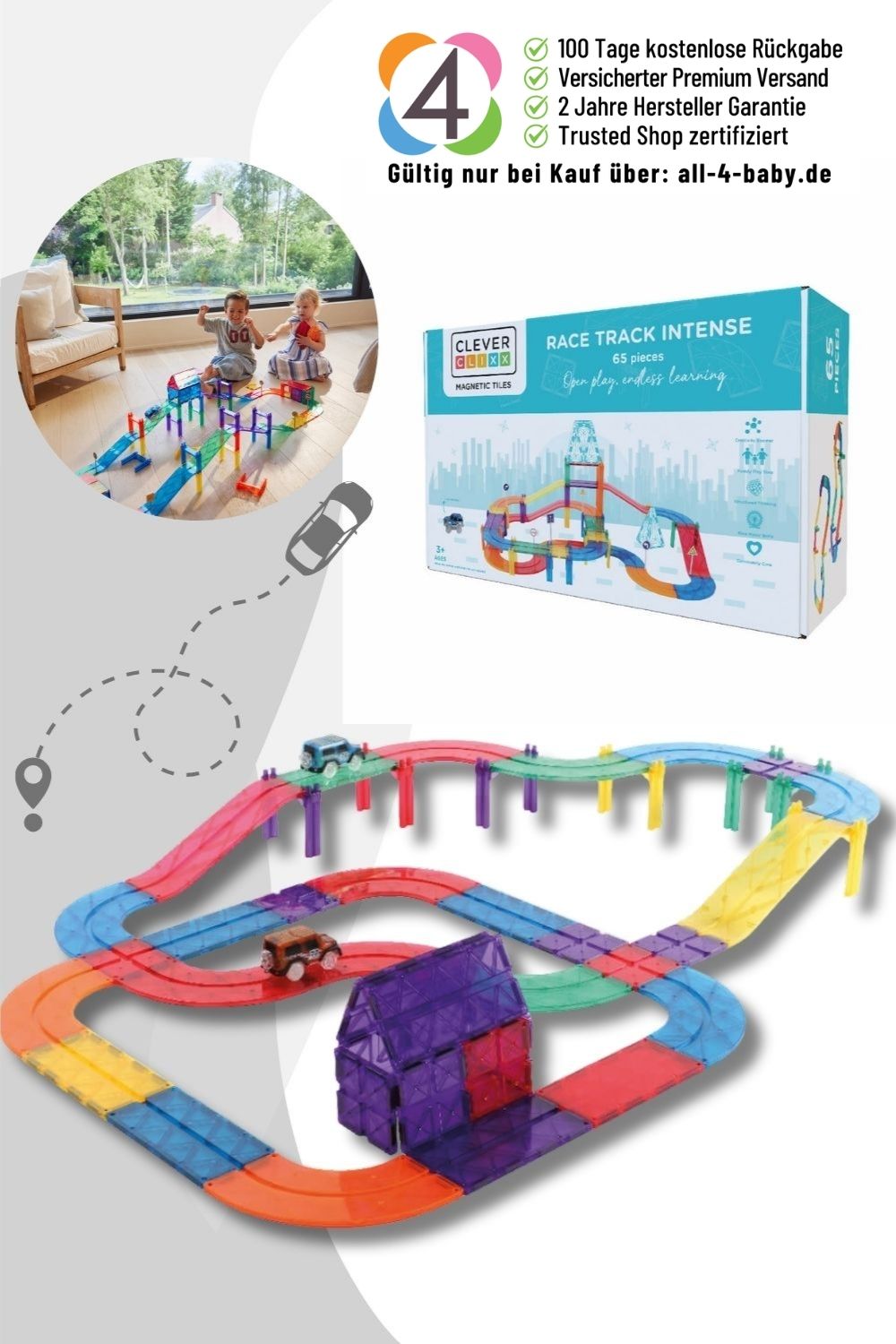 - 65-teiliges Rennbahn-Bausatz mit lebendigen Farben – 65-piece racing track set with vibrant colors