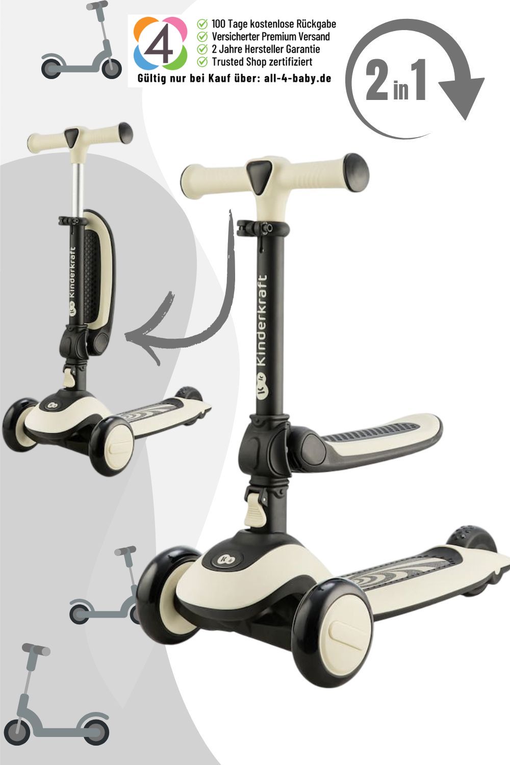 Für Kinder ab 1 Jahr bis 20 kg bin ich das perfekte Laufrad, und ab 2 Jahren bis 50 kg werde ich zum coolen Roller. Mit meinem leichten Gewicht von nur 3 kg lässt sich das Umstellen für Euch mühelos bewerkstelligen.