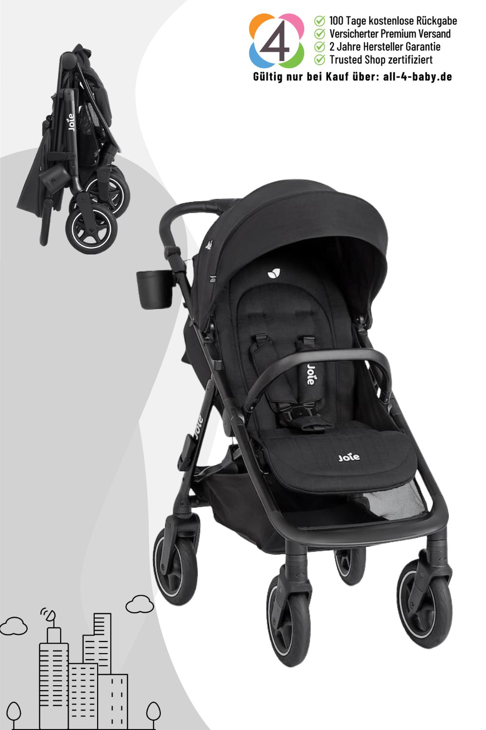 Verlasst euch auf maximalen Komfort dank Allradfederung, Flex-Komfort-Sitzfederung und pannensicheren, schaumstoffgefüllten Reifen. Der große XXL-Staukorb und der seitliche Becherhalter sorgen dafür, dass alles, was ihr braucht, immer dabei ist. Mit dem praktischen One-Hand-Faltmechanismus verschwindet der Wagen schnell und kompakt – ideal für den Alltag in der Stadt und unterwegs.