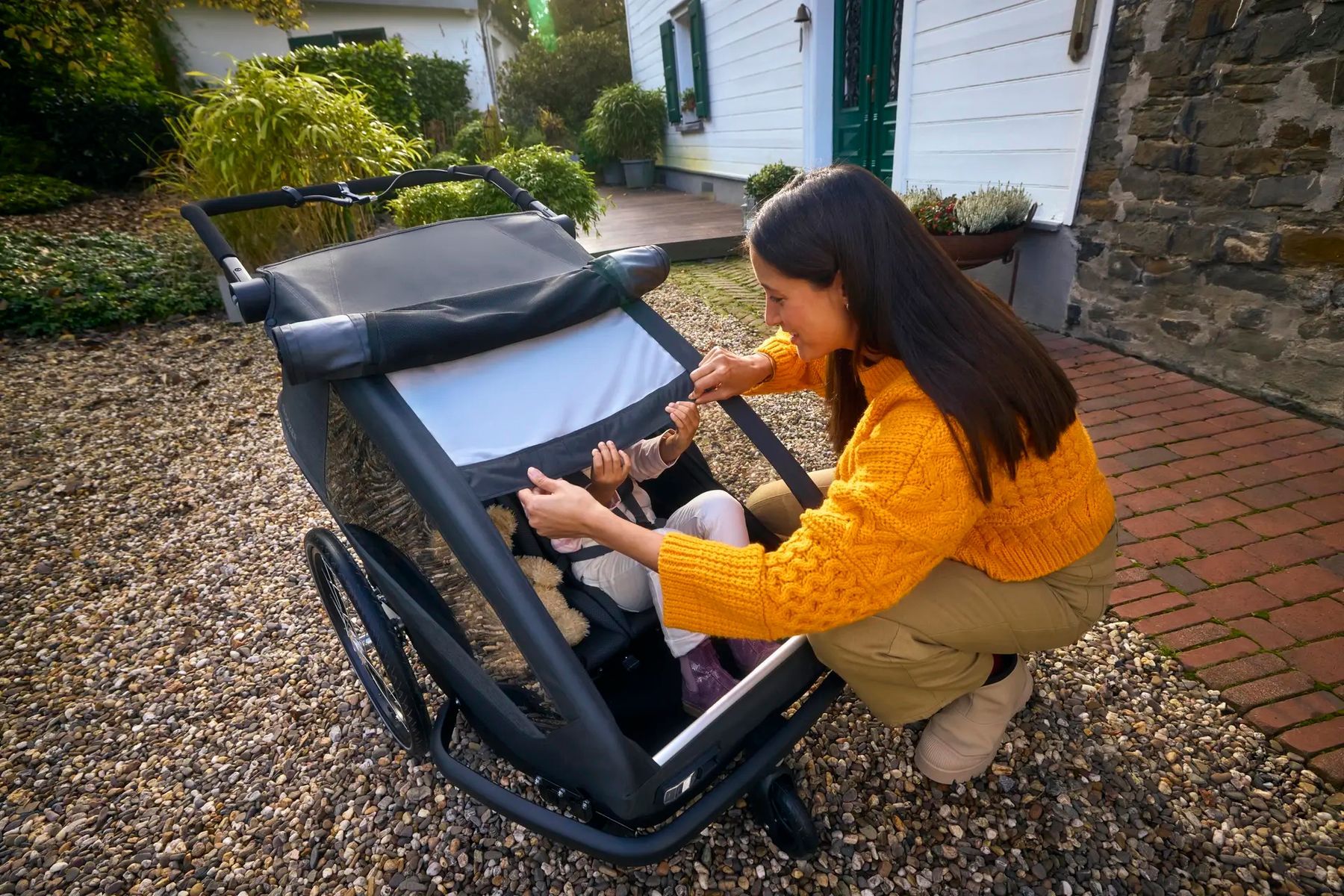 Mit meiner Click & Crooz®-Technologie verwandelt Ihr mich im Handumdrehen vom Anhänger zum Buggy oder Jogger. Dazu kommen starke Details wie 360°-Sicherheitsrahmen, AirPad®-Federung, Handbremse, UV-Schutz, Insektenschutz und viel Stauraum. So seid Ihr für Alltag, Ausflug und Reise bestens gerüstet.