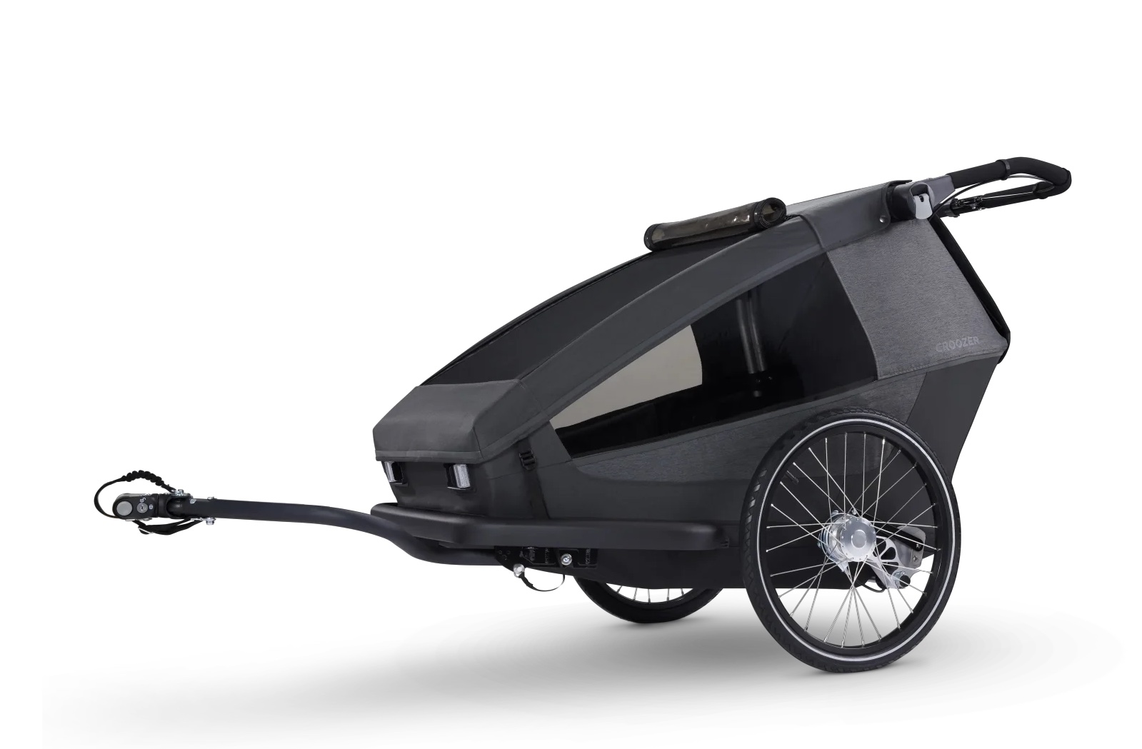 Der stufenlos verstellbare Schiebebügel passt sich perfekt an Eure Körpergröße an (von 90 bis 120 cm) und die drehbare Kupplungsachse sorgt dafür, dass der Croozer stets in sicherem Stand bleibt, selbst wenn das Zugfahrrad einmal umkippt. Sicherheit wird bei uns großgeschrieben – der 360°-Sicherheitsrahmen bietet maximalen Schutz für alle Insassen.
