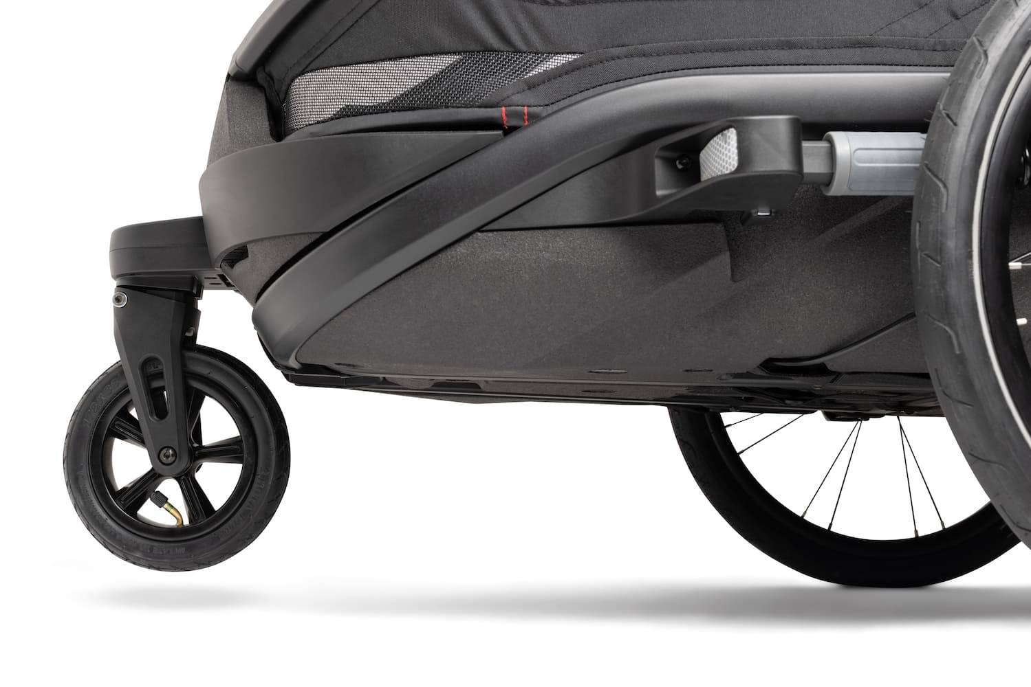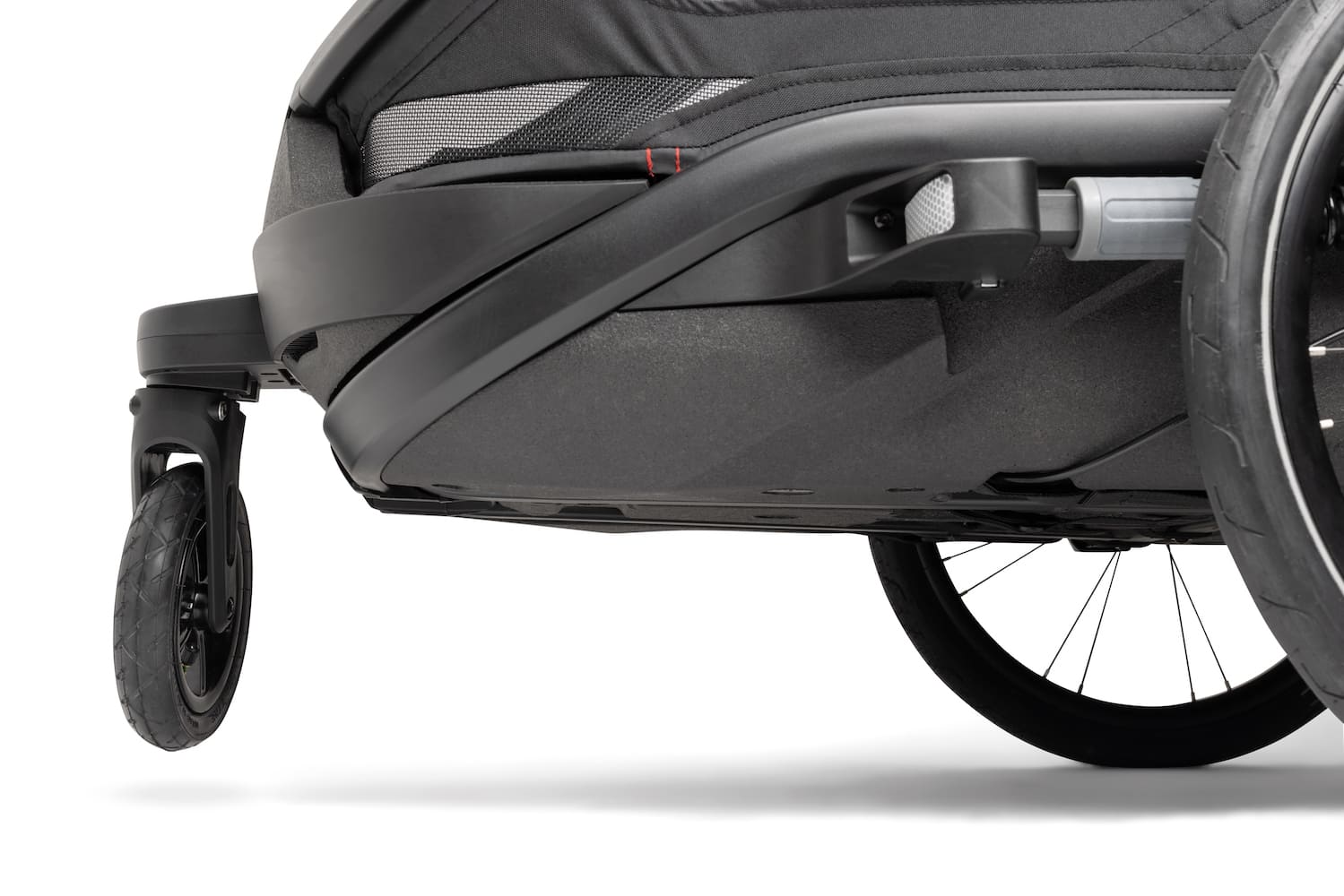 Besonders praktisch im Alltag ist die clevere Aufbewahrung des Buggyrads unter dem Anhänger. Mit wenigen Handgriffen wechselt ihr vom Buggy- in den Fahrradmodus und seid flexibel für Spaziergänge, Radtouren oder den Weg in den Kindergarten. Die neue, stabile und vollständig abgedichtete Bodenwanne schützt den Innenraum zuverlässig vor Schnee, Matsch und Regen.