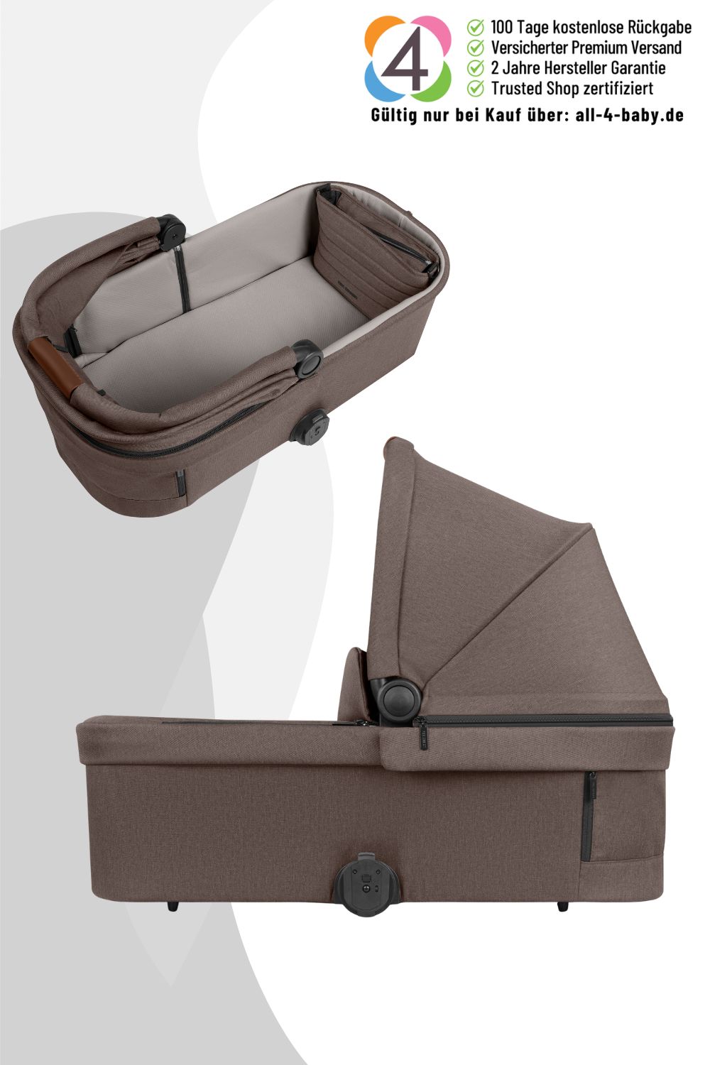 • Stabile, bis zu 9 kg belastbare Rahmenkonstruktion – geeignet für den Übergang vom Neugeborenen zum Kleinkind