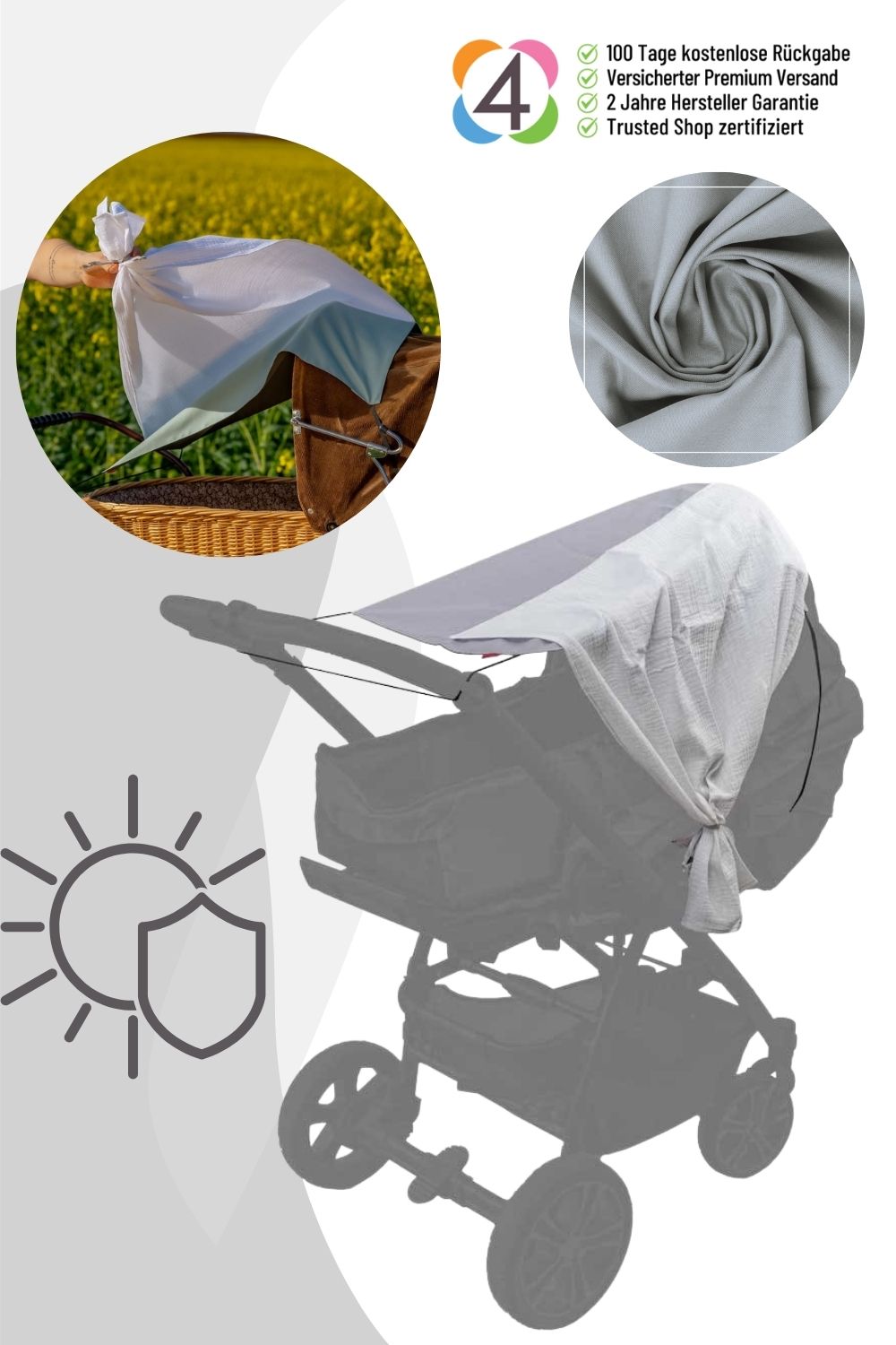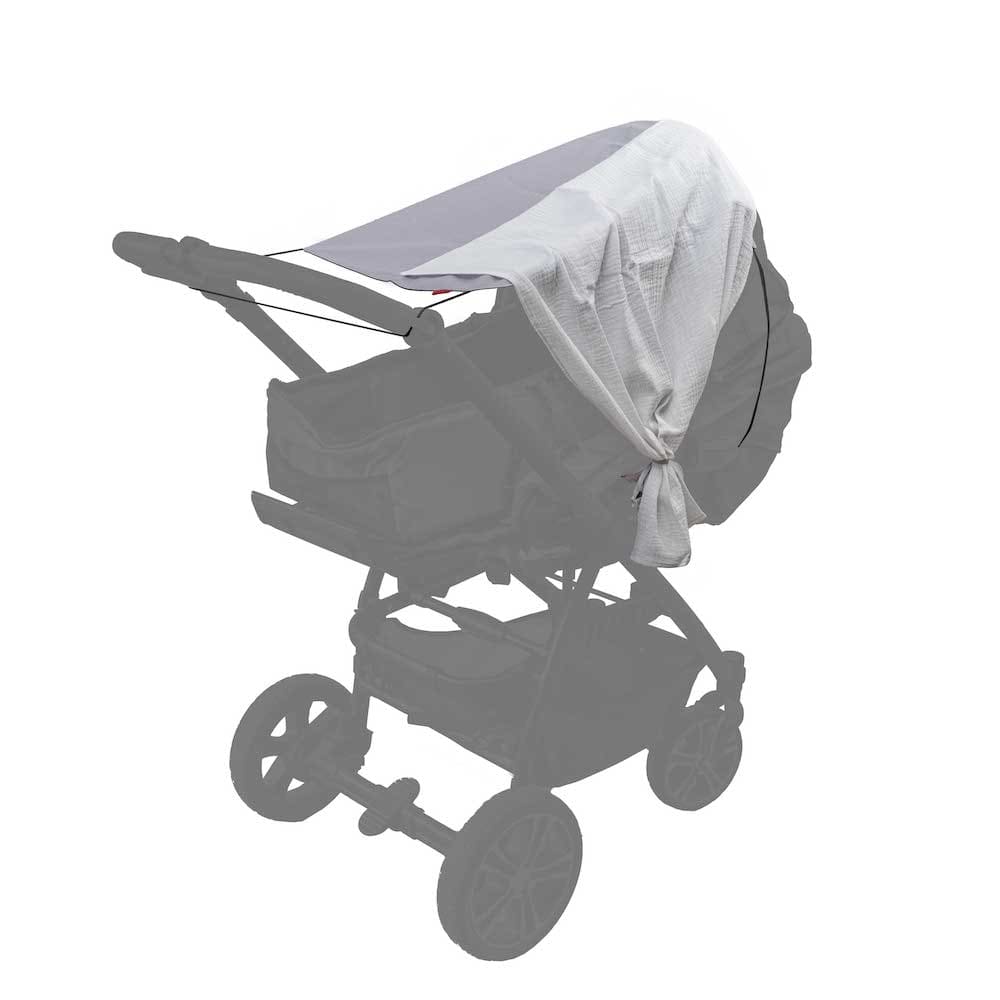 Mein oberes Segel bietet einen hohen UV-Schutz und schirmt die Sonne von oben ab, während mein leichtes, luftdurchlässiges Seitensegel seitliche Strahlung reduziert und gleichzeitig für Frischluft sorgt. Aus atmungsaktivem, weichem Musselin/Double Gauze gefertigt, helfe ich dabei, Wärmestau zu vermeiden und bin sanft zur empfindlichen Babyhaut.