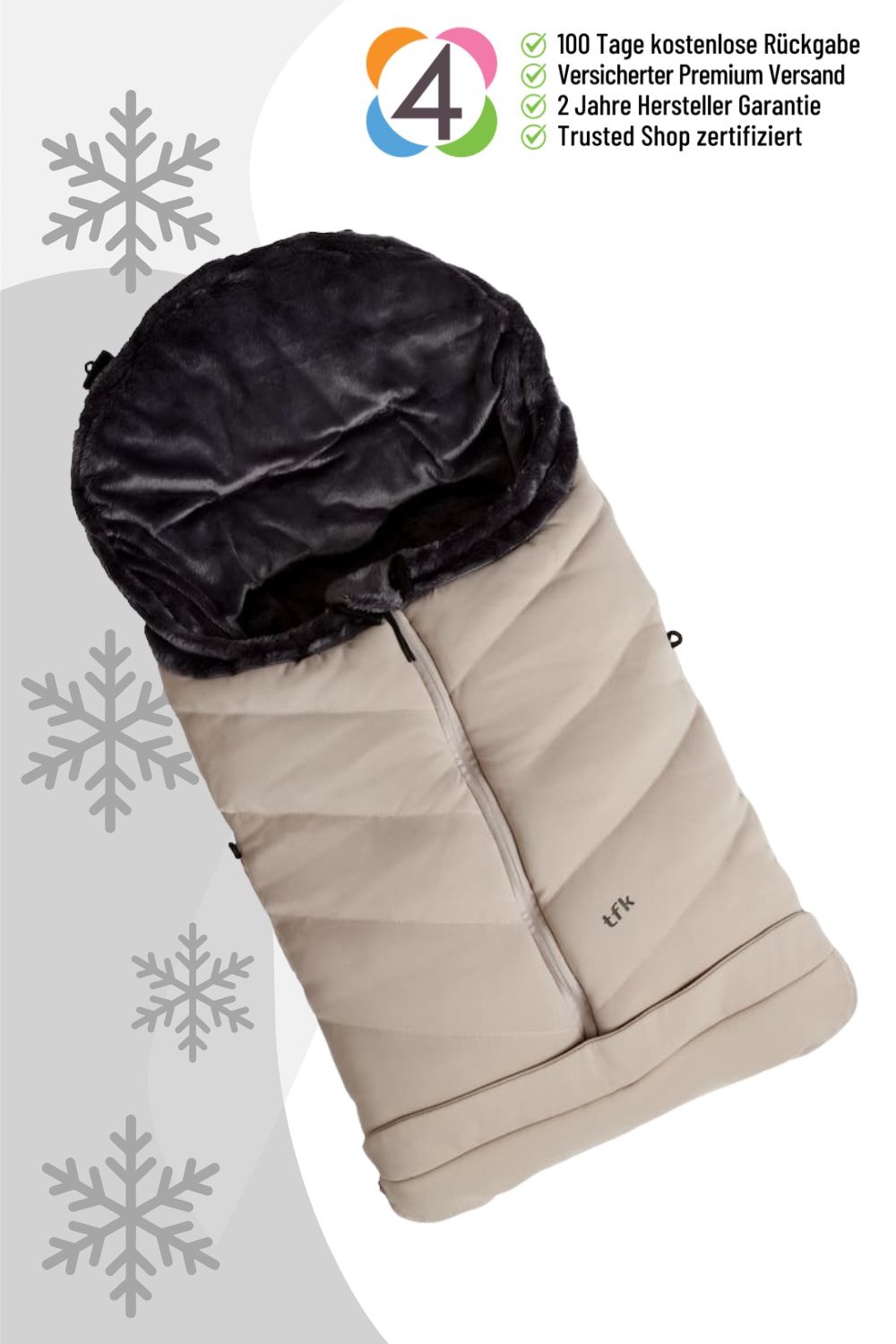 Ich bin der TFK Fußsack und freue mich, Eurer Kind in der kalten Jahreszeit zu begleiten! Mit meiner kuscheligen und flauschigen Innenausstattung sorge ich für optimalen Komfort und ein wohliges Gefühl, das Euer Kind lieben wird. Wenn die Temperaturen sinken, halte ich Euer Kleines schön warm und geborgen – ideal für kalte Tage und winterliche Ausflüge.
