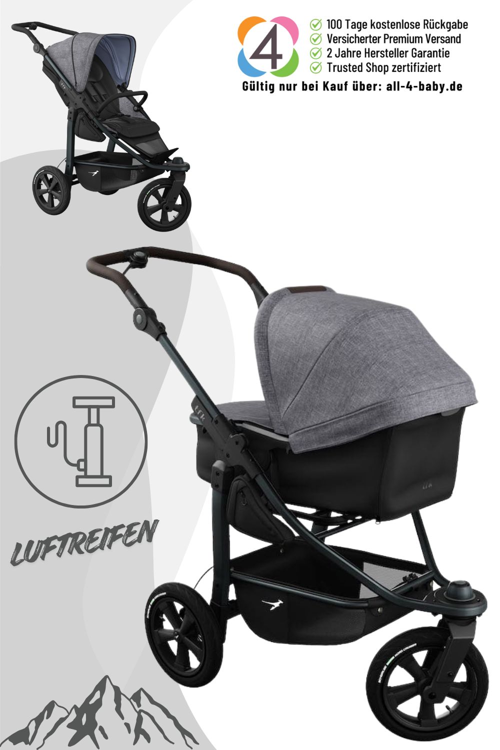 - Wendiger 3-Rad Kinderwagen mit patentierte Kombieinheit (Wanne & Sitz) – nutzbar ab Geburt bis ins Kleinkindalter – all-terrain-stroller with patented combination unit (bassinet & seat) usable from birth to toddler age