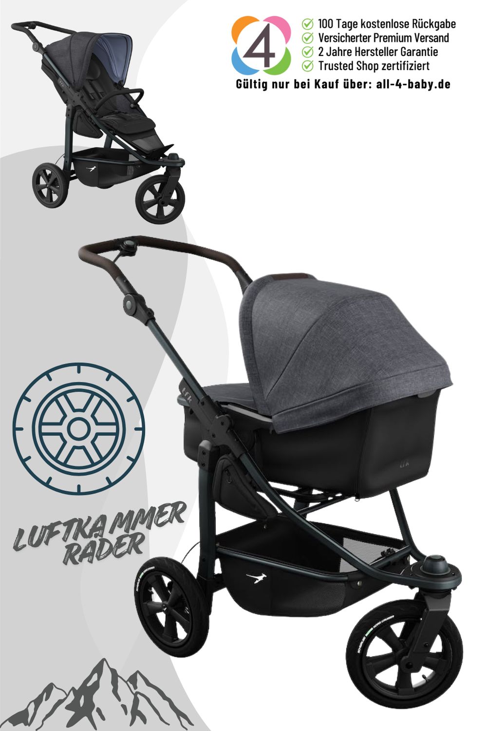 - Wendiger 3-Rad Kinderwagen mit patentierte Kombieinheit (Wanne & Sitz) – nutzbar ab Geburt bis ins Kleinkindalter – all-terrain-stroller with patented combination unit (bassinet & seat) usable from birth to toddler age