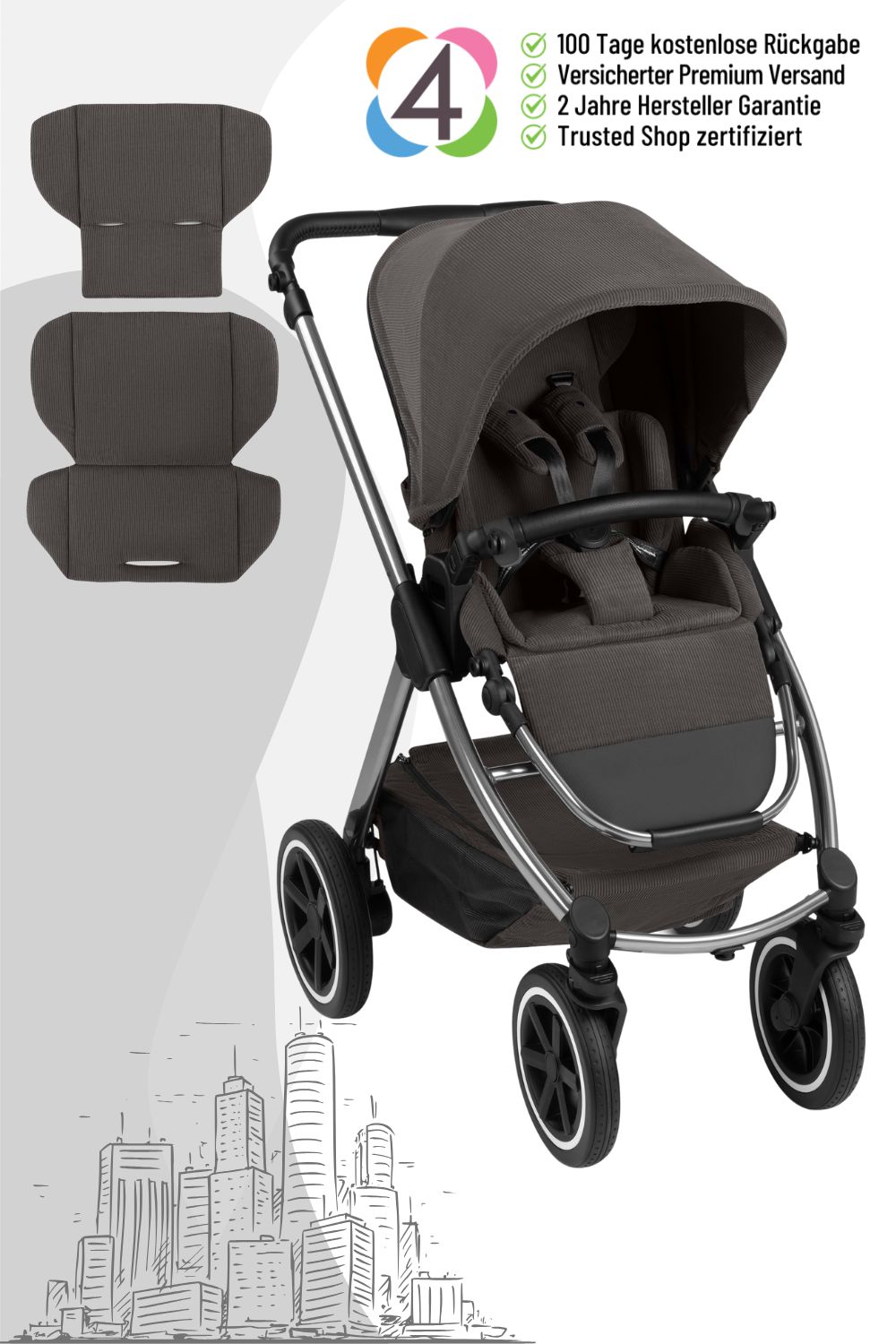 - Reise-System: Möglichkeit, Autobabyschale mit optionalen Adaptern auf dem Kinderwagen zu montieren