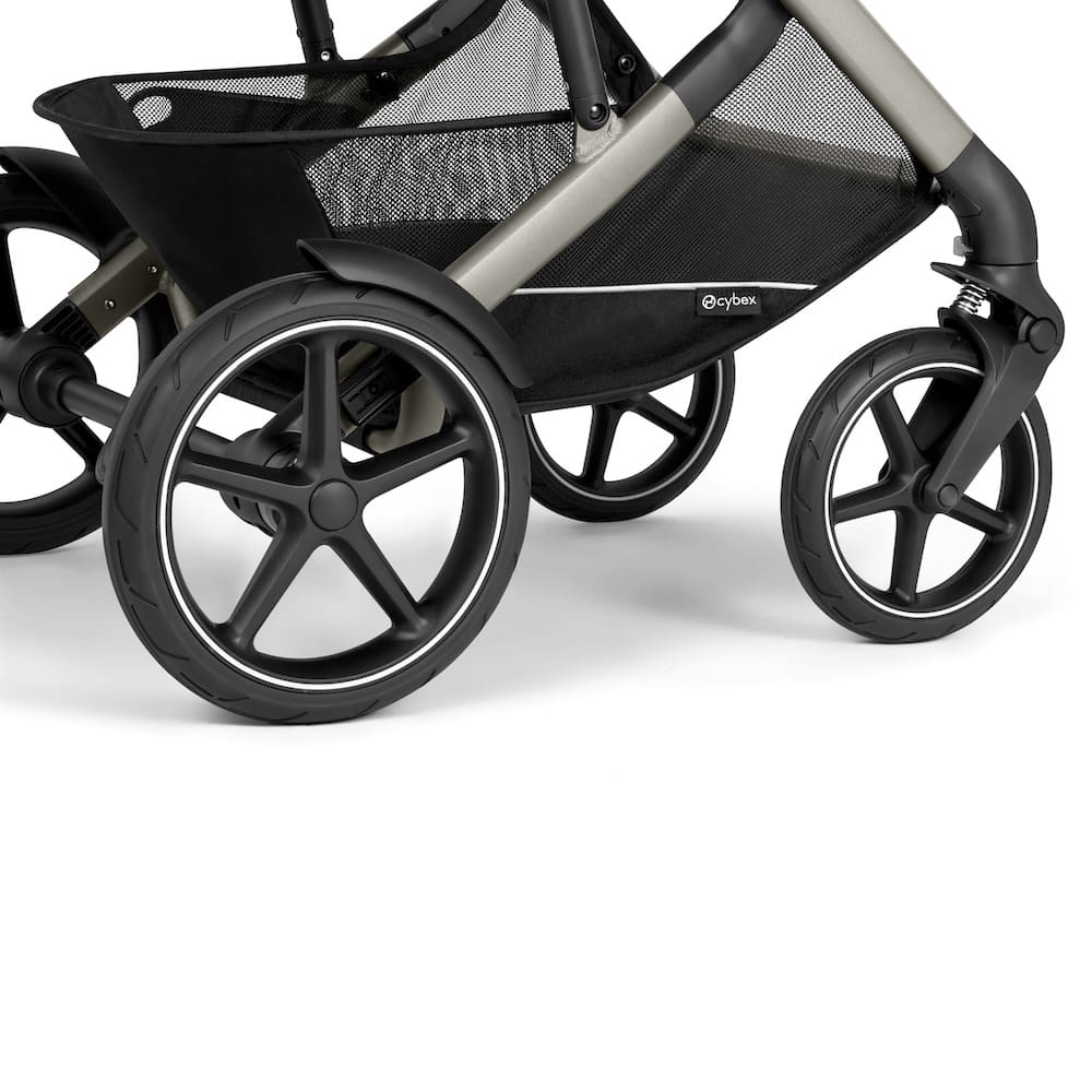 Die Offroad-Federung kombiniert Vorder- und Hinterrahmenfederung für eine angenehm ruhige Fahrt, selbst auf unebenem Gelände. Dank der pannensicheren All-Terrain-Räder meistert der Talos S Lux Sand, Schotter oder Matsch mit Leichtigkeit. Abnehmbare Schmutzfänger sorgen dabei für saubere Touren. Und mit dem Reisesystem lässt sich flexibel zwischen Sitzeinheit, Cot S Lux und CYBEX Babyschale wechseln – für maximale Freiheit unterwegs.