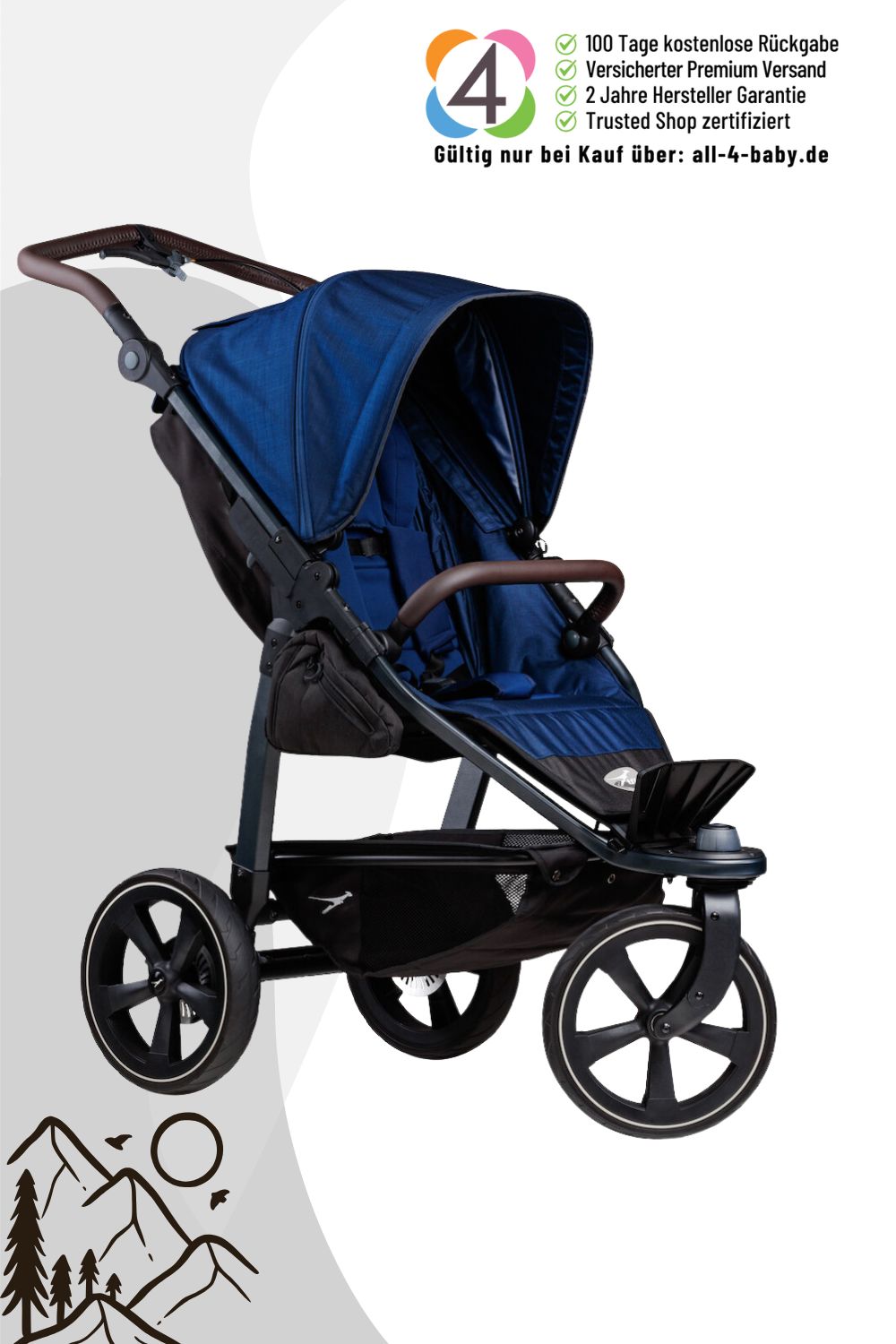 Viele Stauräume nehmen all eure wichtigen Dinge auf, dazu kommt ein großer Einkaufskorb. Reflektierende Bänder am Verdeck und Korb sorgen dafür, dass ihr auch im Dunkeln gut gesehen werdet. Mein höhenverstellbarer Griff passt sich eurer Körpergröße an, und das große Verdeck mit Lüftungsoption und UV-Schutz schützt eure Kleinen vor Sonne und Wetter. Die schmutz- und wasserabweisenden Stoffe mit UV-Schutz 50+ sind zertifiziert und ich bin TÜV-geprüft. Der 5-Punkt-Sicherheitsgurt, die Transportsicherung und mein kleines Faltmaß, das in fast jeden Kofferraum passt, machen mich zu eurem idealen Begleiter für alle Abenteuer.