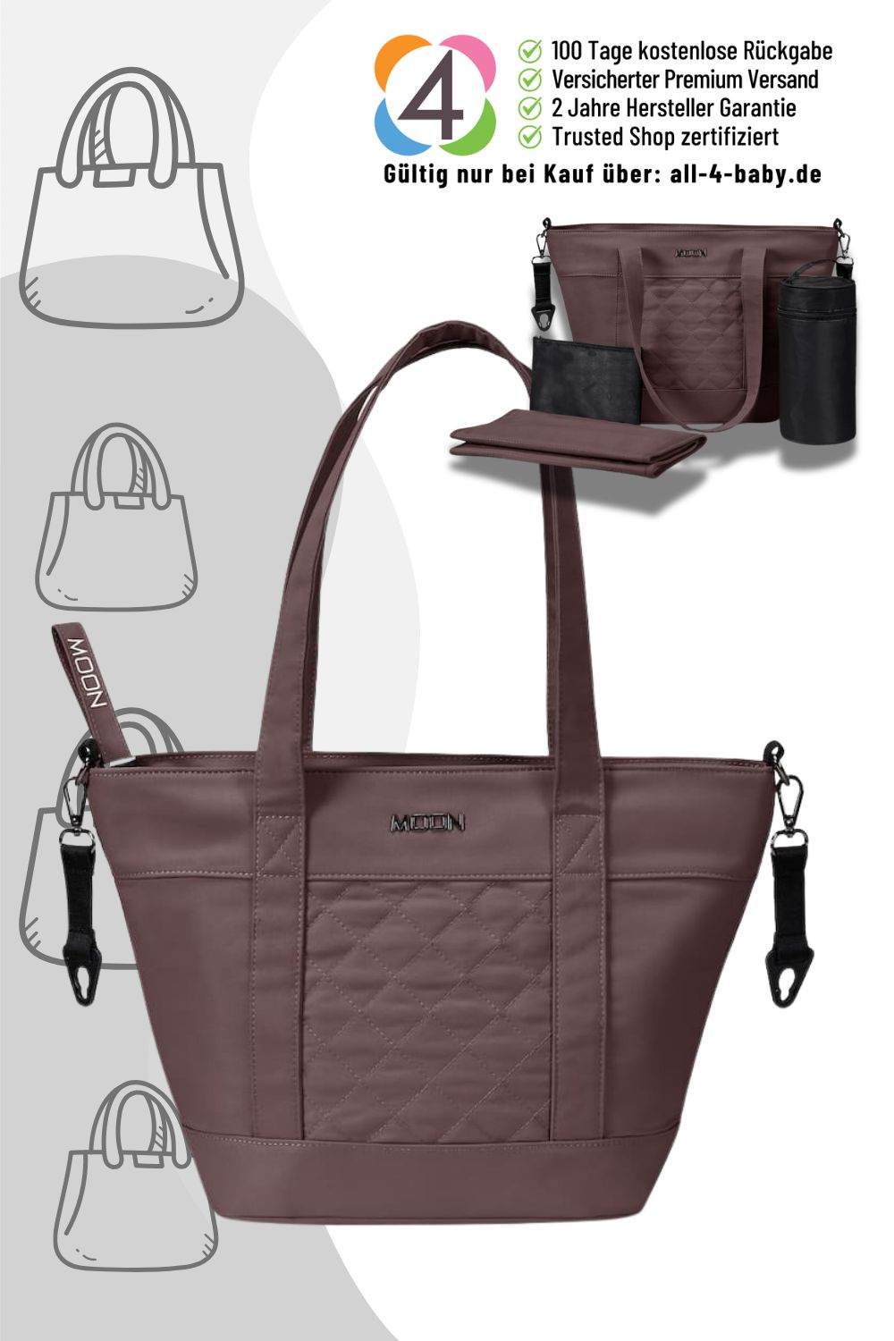 - Inklusive faltbarer Wickelunterlage, Flaschentasche und Geldbeutel – including foldable changing mat, bottle bag, and wallet